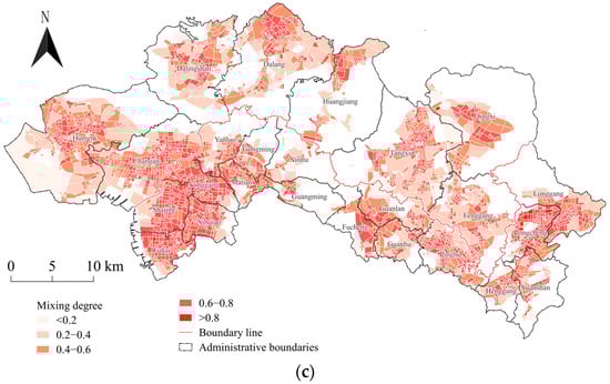 The mixing degree of land use function in 2008–2022. (a) 2008; (b) 2014; (c) 2022.