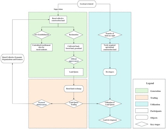 The LQT system, based on “Chongqing Municipal Regulations on Land Quotas”, has three main stages: generation, transaction, and utilization, as illustrated in Figure 1. In the generation stage, rural organizations or households apply to the county-level land department to convert unused, rural, collective-owned land types into cultivated land, woodland, and grassland. After inspections, a portion of land is set aside for farmers’ needs, and the rest is issued to users by the municipal land department. In the transaction stage, rural entities trade land quotas through the Chongqing Rural Land Exchange. Land quotas are sold to users, typically property developers, via listings or auctions. In the utilization stage, the land quota recipient gains the right to use specific land through an “invitation, listing, and bidding” process aligned with land use plans. They use this land quota alongside construction land in the same area to achieve the intended land use.