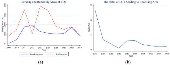 LQT in sending and receiving areas from 2009 to 2018: (a) Describes the LQT in sending areas and in receiving areas separately. (b) Describes the ratio of LQT in sending areas to receiving areas.