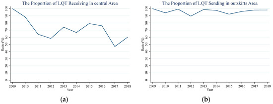 Spatial proportion of LQT areas in sending and receiving areas. (a) Describe the proportion of LQT receiving in urban central areas. (b) Describes the proportion of LQT sending in outskirts of urban areas.