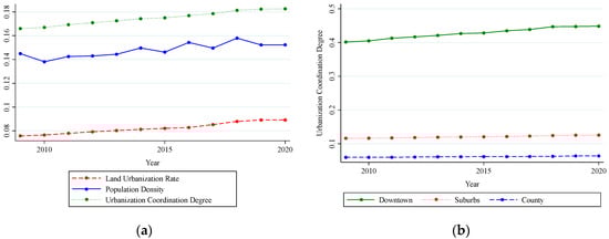 Changes in various urbanization in various locations. (a) Describes changes in the land urbanization rate, population density, and urbanization coordination degree in Chongqing; (b) Describes the changes in urbanization coordination degree across central urban, suburban, and county areas in Chongqing.