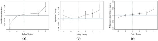 Results of the parallel trend test: (a) Describes the parallel trend test of the land urbanization rate; (b) Describes the parallel trend test of population density; (c) Describes the parallel trend test of the urbanization coordination degree.
