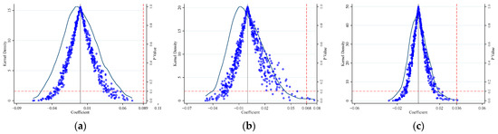 Spatiotemporal placebo test: (a) Describes the spatiotemporal placebo test of the land urbanization rate; (b) Describes the spatiotemporal placebo test of population density; (c) Describes the spatiotemporal placebo test of urbanization coordination degree. The red dashed vertical line symbolizes the coefficient estimates of the LQT policy within the actual treatment group. Meanwhile, the red dashed horizontal line denotes a significance threshold of 10% level.