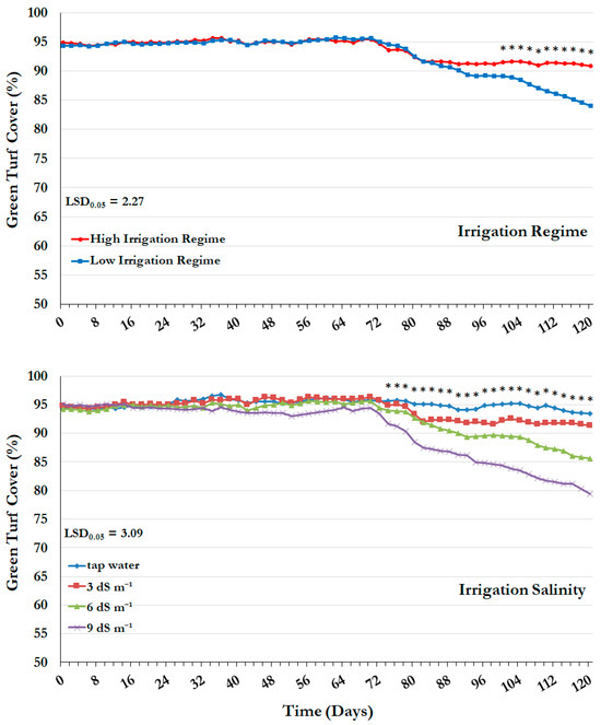 | Source of Variation | Leachate Electrical Conductivity (dS m−1) | Green Turf Cover (%) | Cumulative Clipping Dry Weight (g m−2) |