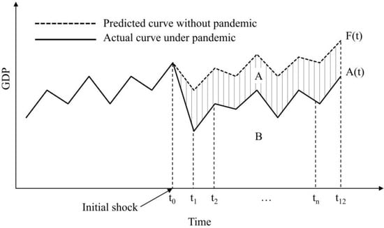 Since the impact brought by this public health emergency has a long recovery time, and the process was several big hits including many small impacts, we used the performance curve model to reflect the dynamic performance evolution of the system better. This approach is common in the study of infrastructure resilience, focusing on the performance loss and recovery time of infrastructure systems after disasters. Bruneau and Reinhorn proposed a function curve for the recovery of performance level to its original state after an earthquake [50]. Cimellaro et al. added the case of over-recovery or failure [51]. Both described the resilience of the area enclosed by the performance curve and the horizontal and vertical coordinates. They neglected the fact that the original performance level of each system and the impact degree are different. Ouyang improved on this model, emphasizing that resilience should be characterized by the ratio of the area enclosed by the disturbed performance curve and the time axis to the enclosed area under normal operation [52]. Zhou et al. applied this method to the economic resilience assessment in post-earthquake disaster areas, using GDP as the performance index of the economic system [53]. In this paper, we construct an economic resilience curve model based on the economic system, using the ratio of the time integral of the actual and forecast quarterly GDP curve. The formula is as follows: