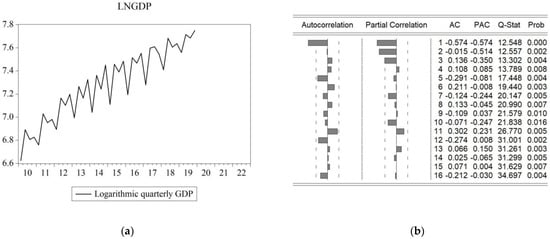 Sample: SARIMA prediction modeling of Nanjing: (a) the time series of logarithmic quarterly GDP from 2010Q1 to 2019Q4; (b) the autocorrelation and partial autocorrelation graphs; (c) the fitting of the predicted value to the observed value.