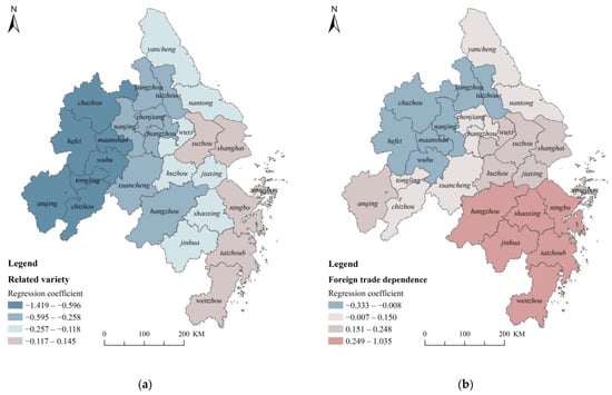 Combining the spatial distribution of regression coefficients (Figure 5a) can help understand this finding. The regression coefficient of each city increases from the west to the east. It has positive effects on coastal cities such as Shanghai, Suzhou, and Ningbo, but negative effects on most cities in the Anhui Province. The reason lies in the difference of leading industries in various regions. Most of the leading industries in Anhui are low-value and labor-intensive. Thus, the high related variety easily leads to industrial isomorphism, path dependence, and lock-in. Therefore, such cities need more unrelated industries, especially knowledge-intensive and emerging industries, to promote the adaptation and renewal of the region under risk. As a comparison, the leading industries in the eastern cities are capital- and technology-intensive, and the risk transmission of related industrial chains after disturbance can be alleviated to some extent. So, enhancing their related variety can make it easier to leap into a new development path through knowledge complementarity and cooperative innovation. In addition, Guo et al. found that with the improvement of regional innovation level, the effect of related variety on regional economic resilience turns from negative to positive [63]. Our findings echo this. The knowledge, technology, and labor quality of Anhui cities are lower than those in the eastern region. It is difficult to support the transformation and upgrading of industrial structure and the transfer of labor force between industries, which inhibits the positive effects of related variety.