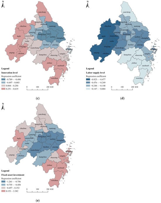 Figure 5c shows that the positive and negative effects of innovation level on the economic resilience of YRD cities are equally distributed. With Shanghai and Suzhou as the low-value centers, the coefficient increases outward in a circular way. Innovation level has a positive effect on the economic resilience of Anhui and Zhejiang cities. Interestingly, the low-value area city overlaps highly with the Shanghai Metropolitan Area city. A possible explanation is that, as a global science and technology innovation center, Shanghai’s innovation-driving role in surrounding regions has matured, and the spillover effect of innovation improvement on economic resilience is somehow limited. For the regional peripheral cities, such as Hangshaoyong, Hewuma, and other surrounding small metropolitan areas, the marginal benefits of improving innovation on economic resilience will be more significant.