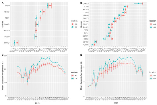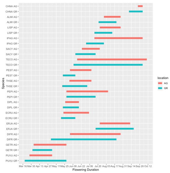 | Species | Year | First Flowering Date (GR) | First Flowering Date (AG) | Mean Flowering Advance (AG-GR, Days) | Max Flower Number (GR) | Max Flower Number (AG) | Flowering Duration GR (Days) | Flowering Duration AG (Days) |
