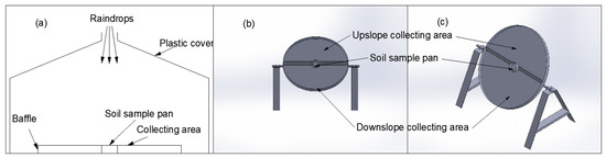 The splash pan used in this study was modified from the Morgan soil pan [41], which is constructed of stainless steel and exhibits a radius of 900 mm and a height of 100 mm. At the center of the pan, there is a soil sample pan with a radius (r) of 100 mm and a height of 100 mm, with small holes at the bottom for rainwater infiltration. A baffle divides the designed splash pan into upslope and downslope compartments (Figure 1), allowing separate measurement of the upslope and downslope splash amounts. Tap water (electrical conductivity = 0.7 dS m−1) was used in all the experiments. To prevent the soil from escaping through the small holes in the splash pan, the bottom of the pan was covered with 1~2 layers of gauze before filling. Before test soil packing, the soil moisture content was adjusted to 14%, which is the typical level during the flood season on the Loess Plateau when most erosion events occur [38]. A bulk density of 1.2 g cm−3 (measured with a cutting ring in a compacted state) was adopted in this study, which is consistent with the in situ values. The samples were scraped flat and placed at the center of the splash pan. At the bottom of the splash pan, there are several 5-mm holes connected to a pipe for splash particle collection. Additionally, to ensure that only the source soil is affected by rainfall, a plastic cover with a 100-mm hole at the center was placed over the device. The slope gradient of the splash pan could be adjusted between 0% and 35%.