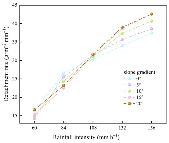 With increasing rainfall intensity, the removal effect of raindrops on the soil surface increased, resulting in more soil particles being separated from the soil. Thus, the detachment rate generally increased with increasing rainfall intensity [9,10,24,25,32,45,46,47,48,49,50,51,52]. However, this increase was not uniform. At rainfall intensities higher than 84 mm h−1, the detachment rate increase decreased for low slopes (0°, 5° and 10°). For high slopes (15° and 20°), the increase declined at rainfall intensities higher than 132 mm h−1. The reason for this phenomenon may be that as the rainfall intensity is increased, the higher induced runoff constrains raindrop splash erosion. Therefore, when the rainfall intensity increases to a certain level, the detachment rate gradually decreases with increasing rainfall intensity [53,54]. With increasing slope, the runoff generated by rainfall spends relatively less time on the soil surface, and the constraint of the runoff depth on splash erosion decreases. Therefore, the inflection point at which the increase rate of detachment decreases at high slopes occurs relatively late [55].
