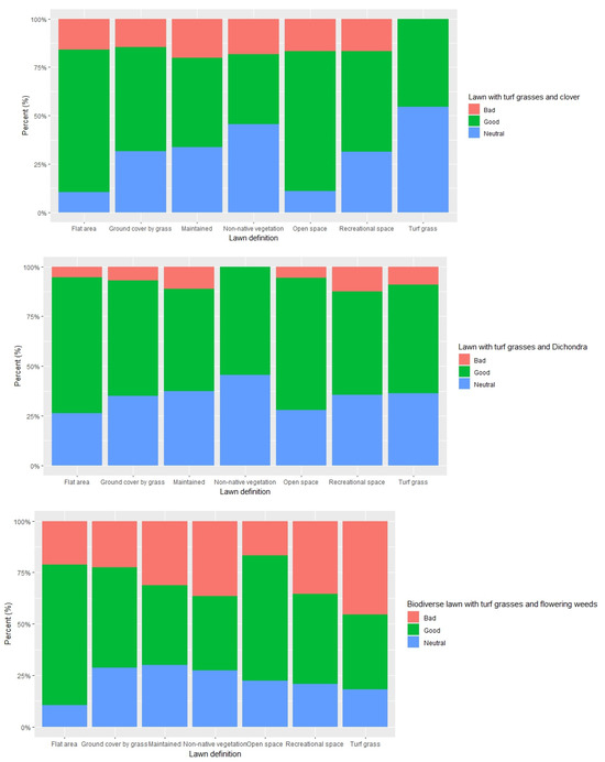 Some respondents provided quite detailed answers where they demonstrated knowledge of horticulture, landscape design and environmental sciences (e.g., “intensively managed area of turf grass and in between of hardscape and softscape”; “a variety of monocot cultured for its consistent pleasing green appearance” and “invasive species of grass”). This can be explained by the level of education of the respondents which is notably higher than the general population for our survey sample (81% university graduates and postgraduates). Other than the response to this question, the level of education generally did not have a significant effect on responses.