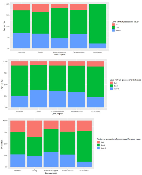 The analysis of “purpose of lawn” answers demonstrated that respondents identified categories similar to the ecosystem services typology indicated in recent lawn research [3,5]. Recreational activity was most common, followed by the aesthetic qualities of lawns (both belong to cultural service), then cooling effect (regulating service), ecosystem support and social status. The appearance of “Ecosystem support” in participants’ answers also indicated the respondents’ awareness of environmental issues in urban environments such as urban heat and increasing dryness. The dominance of recreational use can be also explained by the climatic reasons and lifestyle of the people of Perth who are using the advantage of sunny and warm climates for recreational activities and can use lawns throughout the year. The positive effect of lawns for cooling urban spaces during the summer months in the Mediterranean climate has been indicated also for Santiago de Chile [46].