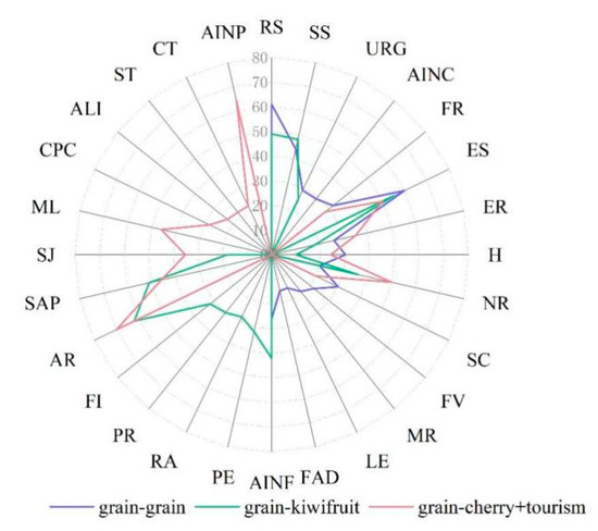 Well-being scores were computed for each agricultural type (Table 9). The results indicated that human well-being improved in all three agricultural transitions from 2000 to 2020. The “grain-kiwifruit” transition saw the most significant increase at 33.80%, followed by the “grain-cherry + tourism” at 25.75% and the “grain-grain” at 20.37%.