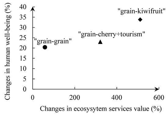 Comparing the changes in ecosystem services and human well-being under the three different agricultural transformations, Figure 4 indicates that there is a strong relationship between ecosystem services and human well-being (Figure 4). Between 2000 and 2020, the value of ecosystem services experienced the most growth (505.15%) in the “grain-kiwifruit” transformation, while the largest growth of well-being was observed (33.80%). The value of ecosystem services and human well-being significantly rose by 64.06% and 20.37%, respectively, in the “grain-grain” transformation. And in the “grain-cherry + tourism” transformation, a similar increase in well-being occurred as in the “grain-grain” transformation, but a larger increase occurred in the ecosystem service value (326.84%). The results indicated that the agriculture transformation in the Xi’an metropolitan zone from grain cultivation (mainly including wheat and maize) to cherry-picking tourism and to fruit (kiwifruit) led to a significant increase both in ecosystem services and well-being, especially in the “grain-kiwifruit” transformation. These suggested that the transition from traditional agriculture to urban agriculture (e.g., fruit or fruit planting combining with tourism, vegetables planting.) would fully improve ecosystem services and human well-being.