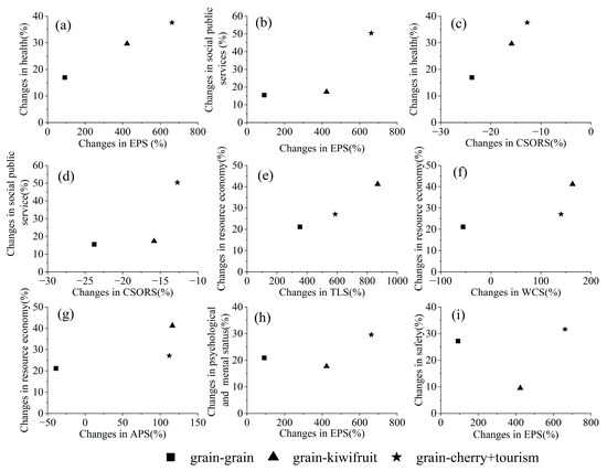 Changes in ecosystem services and human well-being in different agricultural transformations. Note: (a) changes in economic production services and health, (b) changes in economic production services and social public service, (c) changes in carbon sequestration and oxygen release services and health, (d) changes in carbon sequestration and oxygen release services and social public service, (e) changes in tourism and leisure services and resource economy, (f) changes in water conservation services and resource economy, (g) changes in air purification services and resource economy, (h) changes in economic production services and psychological and mental status, (i) changes in economic production services and safety.