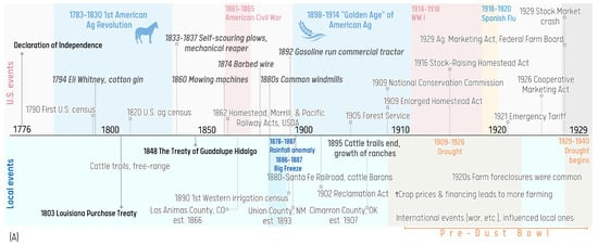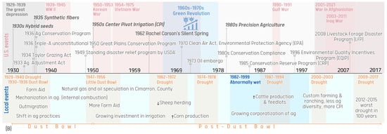 Timeline showing national (policy and technology development) and local (study area) events impacting agriculture and milestones related to land and water use. Section (A) from 1776 to 1929 and (B) from 1930 to 2017. Emphasized here are Pre-Dust Bowl, Dust Bowl, and Post-Dust Bowl time periods, with the addition of settler history events and policies. Note: Arrows indicate general trend direction (increase/decrease).