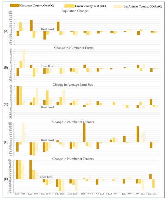 The agricultural policies discussed above significantly impacted our study area’s growth and LULCC trajectories. Before the Dust Bowl, the Homestead and Railway Acts, generally favorable rainy conditions, and promising results from the ‘Golden Age of American Agriculture’ motivated people to move to the tri-county/tri-state study area, one of the last (so-called) frontiers in the U.S. From 1910 to 1920, both UC and LAC’s population grew, as did the number of farms (see Figure 3A,B, Table 1). However, CC experienced a reduction both in population and number of farms during this period, consistent with what Worster [10] (p. 105) called “the great scramble out of privation and hardship, remoteness and invisibility” that sometimes followed the acquisition of land under misleading promotion.