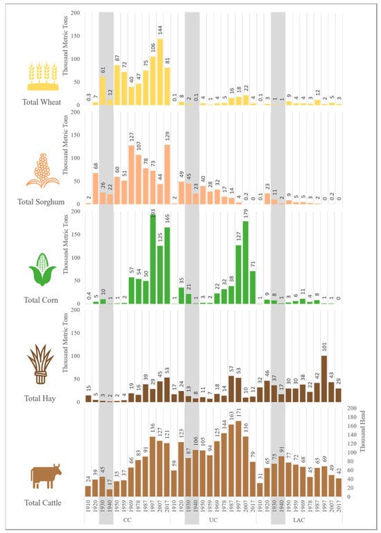 Second, to analyze agricultural change over these periods, we present descriptive statistics using the USDA’s Census of Agriculture Historical Archive (1910 to 2017) from the decennial censuses and the U.S. Census Bureau [19,20]. While the U.S. census of agriculture dates back to 1820, the three counties analyzed in this study have different establishment dates: LAC was founded in 1866, UC in 1893, and CC in 1907. As a result, we discuss policy development during the period of western expansion in the 19th century but only present agriculture census results, starting with the earliest survey that captures all three counties, the 1910 survey. With the Dust Bowl as our flashpoint, we framed our results into three periods: “Pre-Dust Bowl” uses the 1910 and 1920 censuses, “The Dust Bowl” considers the 1930 and 1940 censuses, and “Post-Dust Bowl” draws on census data from 1950 to 2017. Additionally, we use the U.S. Census Bureau website to complete demographic data. Changes are then viewed in the context of the historical developments and agricultural policies discussed in the previous section.