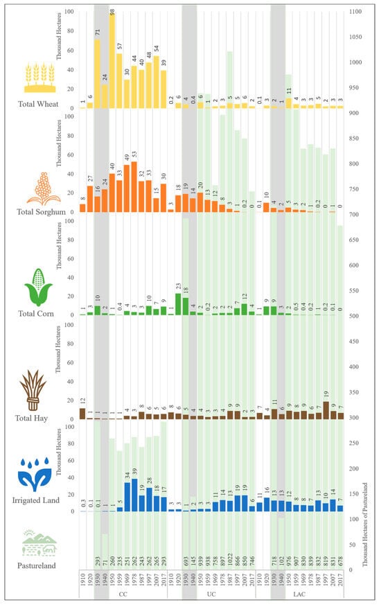 The main commodity crops in our study area from 1910 to 1920 were corn, sorghum, hay, and wheat (Figure 4 and Figure 5 and Table 2). Additionally, all three counties reported smaller amounts of oats, rye, and barley (Table 3). In the 1910 census, hay accounted for the majority of the hectares dedicated to cropland in the study area, demonstrating the regional importance of livestock feed. By 1920, though, the main crop in CC was sorghum, while in both UC and LAC, corn and sorghum dominated. Overall, the hectares of main commodity crops increased in in all three counties from 1910 to 1920 as part of agricultural extensification (see Figure 5, Table 2). Both wheat and corn, in particular, saw substantial increases in each of the three counties during this period.