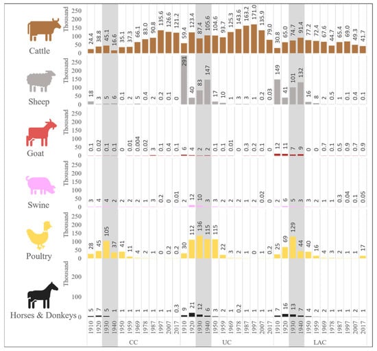 Pastureland and farm animals in Cimarron County, OK (CC); Union County, NM (UC); and Las Animas County, CO (LAC). Note: The Dust Bowl period is shaded in light gray.