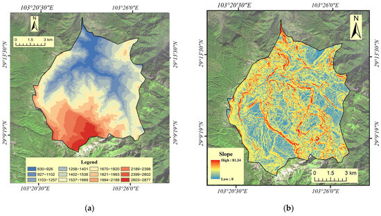 Optical pixel offset was employed to extract surface deformation data. To ensure the map aligns closely with the authentic features of the local valley ridgeline, vector data representing slope units were computed from the digital elevation model (DEM) using hydrological analysis [36,37,38], and elevation (Figure 7a) and slope factor (Figure 7b) were extracted by using ArcGIS software (version 10.7). The highest elevation in the region is 2877 m, the lowest is 630 m, and the height difference is large. The change in NDVI based on the influence of elevation and slope was selected as the index parameter to analyze the development of landslide debris flow [39,40,41].