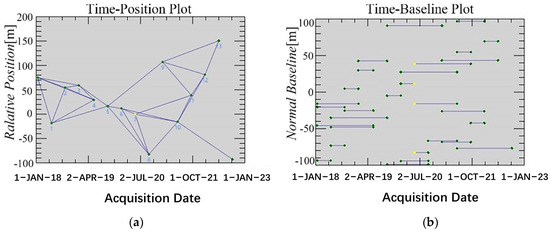 Table 4. Basic parameters of interference pair.The 12-day time baseline was taken as the threshold, interference pairs with poor coherence were excluded, and the estimated results met the experimental requirements. The generated connection diagrams of time baseline and space baseline are shown in Figure 9a and Figure 9b, respectively.