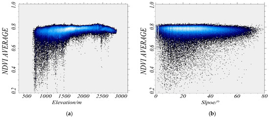 (a) Scatterplot of NDVI mean value variation with elevation; (b) scatter plot of NDVI mean value with slope variation.