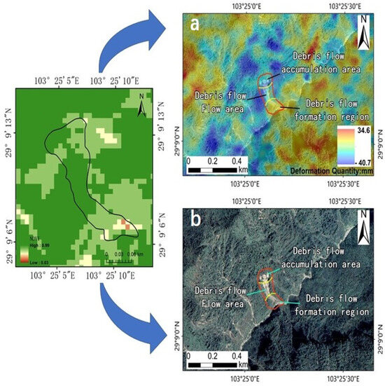 (a) Optical remote sensing extraction map of landslide debris flow in the study are; (b) SBAS-InSAR extraction map of landslide debris flow in the study area.
