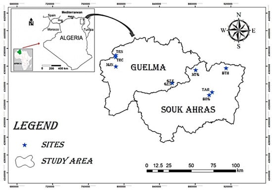 The study area is located in northeastern Algeria (Figure 1), amidst the semi-arid zone to the south of Souk Ahras, the humid and sub-humid area to the north of Souk Ahras, and the sub-humid bioclimatic zone of Guelma [31].