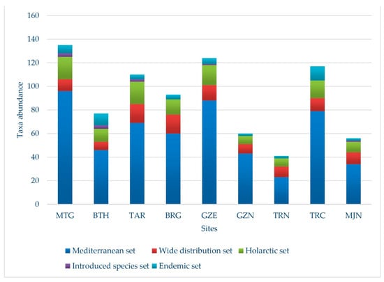 Taxa abundance per chorological group at each site. MTG: El-Matlegue; BTH: El-Batha; TAR: Taoura; BRG: Burgas Lake; GZE: Guelta Zarga Effesus; GZN: Guelta Zarga Nigricans; TRN: Taya Ranuncule; TRC: Taya Rockery; MJN: Madjen Belahriti.