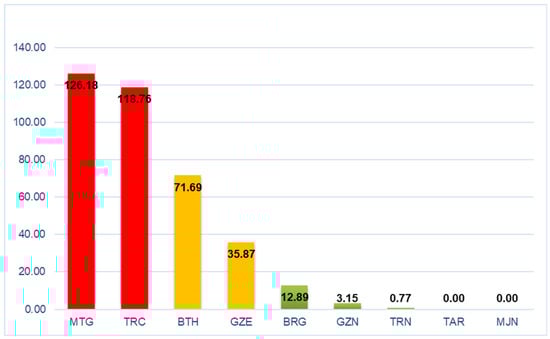 Taking the floristic data obtained from field inventories (Table S1), the Shannon Index is calculated to determine the diversity in each of the 9 studied wetlands. The test results are displayed in Table 9, where MTG exhibits the highest Shannon diversity index, followed by GZE and TRC. The lowest values correspond to GZN and TRN.