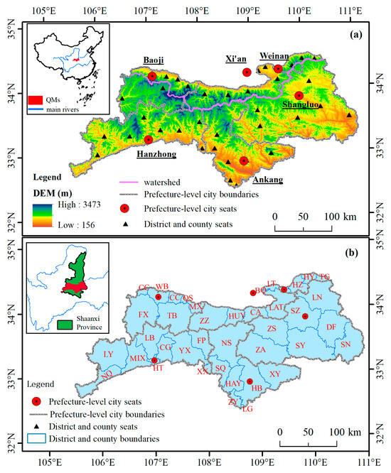 Overview of the Qinling Mountains: (a) geographical range, elevation, district and county seats, and prefecture-level city seats in the QMs; (b) administrative division of prefecture-level cities and districts and counties in the QMs.