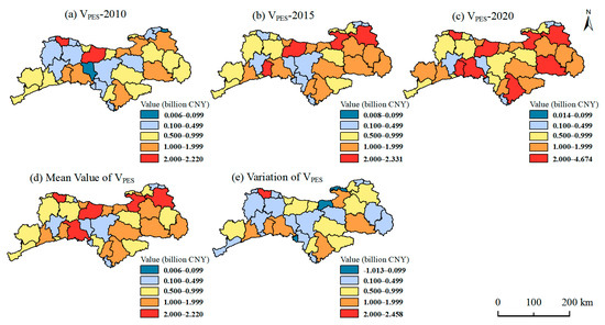 In the whole QMs, the cumulative PES values of all districts and counties in 2010, 2015, and 2020 were 29.28 billion, 35.86 billion, and 51.30 billion CNY, respectively. Over the years, PES in the whole area showed a continuous upward tendency, with a growth rate of 75.17%. In terms of stage change, the growth rate of PES in the first five years was 22.44%, while the greater growth rate in the second five years reached 43.06%.