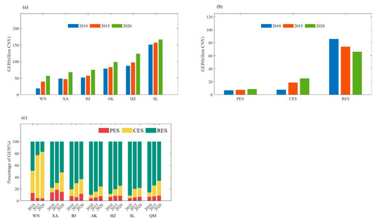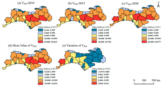 In the whole region, the cumulative RES values of all districts and counties in 2010, 2015, and 2020 were 373.22 billion, 355.60 billion, and 390.05 billion CNY, respectively. RES in the whole region of the QMs had a fluctuation trend with a growth rate of 4.5% in the decade. In terms of stage change, the first five years showed a downward trend with a decline rate of 4.7%, and the second five years showed an upward trend with a growth rate of 9.7%. However, from the perspective of the magnitude of change, the changes in each county and district in this decade were not large.