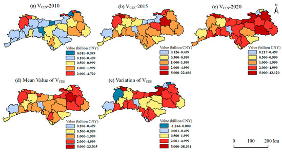 The spatial pattern of CES underwent significant changes from 2010 to 2020 (Figure 5). In 2010, CES was generally higher in the east and lower in the west. There were five districts and counties with a value less than 0.10 billion CNY and five districts and counties with a value more than 2.00 billion CNY. In 2015, CES in the whole region increased significantly, and only Luonan County and Hanyin County showed a slight decline in CES. In 2020, there was a downward trend in eight districts and counties and an obvious increase in other regions in CES. In particular, Linwei District exceeded 20.00 billion CNY. In terms of total volume, seven districts and counties in the region were above 5 billion CNY in CES, and only nine districts and counties were below 1 billion CNY.
