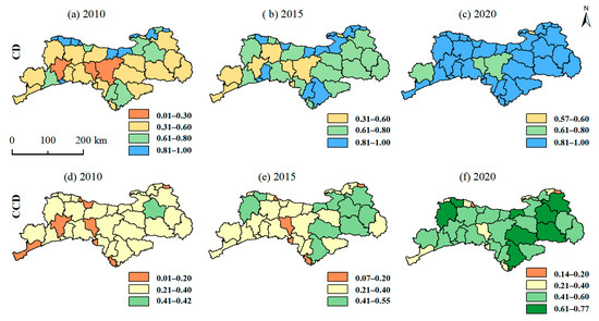 Coupling Degree can effectively characterize the interaction between multiple systems; however, it solely represents a resonance relationship, which fails to adequately reflect the overall synergy effect and development level between multiple systems [46]. On the basis of Coupling Degree, the Coupling Coordination Degree can provide a deeper reflection of the development of two systems [47]. The calculation formula is as follows: