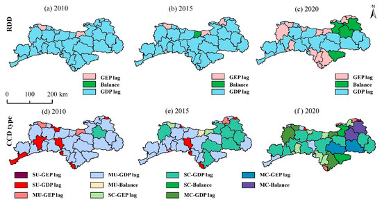 where and refer to normalized GEP and GDP, respectively, represents the relative development status of these two subsystems in the eco-economic system. Based on the relevant research results and the quotient of normalized GEP and GDP, the RDD in the QMs is divided into three types: GEP lag, GDP lag, and Balance [29,39]. Among them, GEP lag indicates that ecology lags behind economic development, GDP lag indicates that the economy lags behind the ecological status, and Balance indicates that ecology and the economy have achieved synchronous and balanced development.