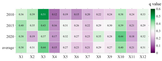In data processing, the vector layers of six landscape pattern indices from 2010 to 2020 were calculated using the moving window method in Fragstats 4.2, based on the land use data. At the same time, since geographic detectors are effective at processing type variables, this study first processed variables X1–X12 as categorical variables using the natural split point method in the ArcGIS 10.6 platform. Then, according to the boundaries of different districts and counties, the type variables of different indicators in different regions are obtained using the tool Zonal Statistics as Table in the ArcGIS platform, so that the driving force analysis can be carried out with the geographic detector.