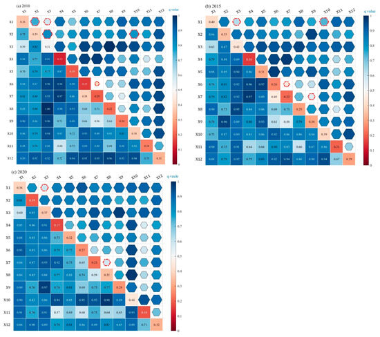 By employing interaction detection, the impact of driving factors on the spatial differentiation of CCD in different years can be further investigated. These years, under the pairwise interaction of influencing factors, the contribution degree q to the spatial variation of CCD was greatly enhanced (Figure 11). These results indicated that these factors had a good synergistic effect on the spatial variation of CCD in the QMs and could promote or inhibit the spatial variation of CCD at the same time. From the perspective of the category, these interaction types were mainly manifested as nonlinear enhancement, and a small number of factors were manifested as bifactorial enhancement.