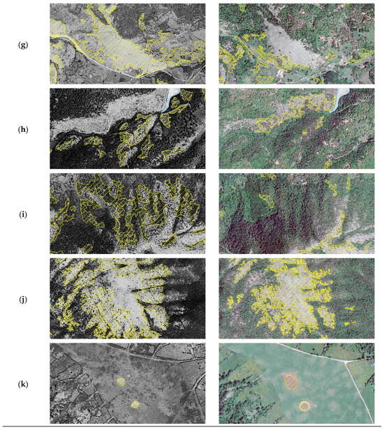 The land use and land cover categories (Table 1 and Figure 2) were determined based on the interpretation of historical photographs. Consequently, while recent images allowed recognition of compositional types like trees, shrubs, and herbaceous formations, these distinctions were not made. However, for herbaceous formations, it was feasible to outline areas corresponding to sinkhole depressions that exhibited distinct tonal variations. Among tree formations, identification of fruit chestnut groves was achieved by analogy with more recent remote sensing layers. Tree and shrub density classes were differentiated due to their distinct recognizability and relevance for evolutionary analysis.