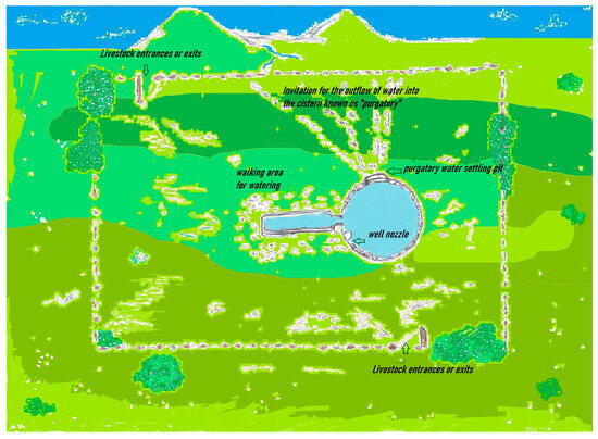 The Roman hydraulic systems created to support livestock and agricultural production and the rural communities consisted of cisterns, some of considerable size, with a circular (Figure 4), square, or rectangular shape. They were constructed using local stones, both in the countryside and along mountain slopes, with water diversion systems made of stones to channel water into the reservoirs. The bottom was sealed using the technique of ‘cocciopesto’ [63]. Close to the cistern, a single-basin watering trough was positioned, which the herder filled by drawing water from the cistern using a bucket attached to a rope. This action was conducted conveniently from a built-in position at the cistern’s edge, known as the ‘bocca di pozzo’. The pavement surrounding the watering troughs prevented the degradation of the trampled ground by animals and the consequent formation of muddy areas, known as the ‘purgatory’. According to accounts from herders who still utilize these traditional cisterns, in cases where herds from multiple owners converged for watering, two separate entrances, located on opposite sides, allowed for controlled animal flow using a rotational system. This ensured that the two groups of animals never came into direct contact. A schematic representation is presented in Figure 4.