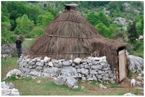 Pastoral settlements involved a combination of a circular hut and a second ellipsoid or rectangular hut: the former usually served as the temporary residence of the shepherd-farmer (locally referred to as ‘capanna lepina’, Figure 6), while the latter sheltered the raised animals. Additional small houses could be added for agricultural tools, cheese production, or hay storage. These huts had a stone base and a thatched roof. The perimeter wall was built dry, without binders, using large, uncut stones and with considerable thickness. The entrance opening was covered by a wooden lintel. The roof had the characteristic conical vegetal structure, reinforced by a sturdy framework of branches, and covered with a thick layer of mountain straw.