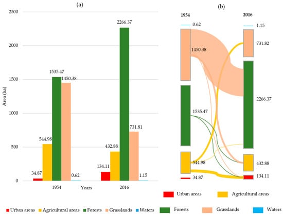 The data illustrate land cover changes between 1954 and 2016 across distinct categories (Table 4, Figure 8 and Figure 9). Urban areas have experienced a substantial increase from 34.87 hectares to 134.11 hectares (284.72%), signifying important urbanization. Conversely, agricultural areas displayed a decrease from 544.98 hectares to 432.88 hectares (−20.57%) as well as grasslands that underwent a considerable reduction from 1450.38 hectares to 731.82 hectares (−49.50%). In contrast forested surfaces notably expanded from 1535.47 hectares to 2266.37 hectares (47.56%). The marginal rise in water areas from 0.62 hectares to 1.15 hectares (85.48%) suggests minor changes in aquatic features.