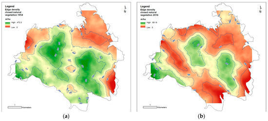 The ED represents the total length of the edge of a land cover class divided by the unit area. We focused on the edge between closed vegetated areas (forests and shrublands) and open habitats (grasslands and croplands) computing the ED of closed natural vegetation. According to Forman and Godrom [54], the edge effect has a considerable influence on environmental conditions and organisms inhabiting a habitat. It is known that it can affect temperature, humidity, light, and wind exposure, and consequently, the distribution and the abundance of living organisms, both vegetables and animals, driving ecosystem dynamisms and human–wildlife interaction risk such as road accidents, agricultural damages, and livestock predation [55,56,57,58,59].