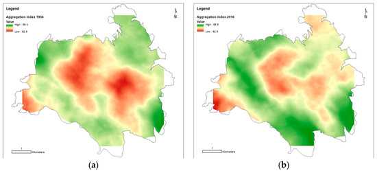 The AI is considered highly effective in quantifying, as the inverse, the degree of the overall landscape fragmentation and heterogeneity [60]. This index varies from 0 to 100, with higher values indicating higher aggregation level and low fragmentation as inverse. In synthesis, AI measures how frequently a patch of a land cover type or habitat is found adjacent to another of the same type compared to a random arrangement. A high AI indicates that the patches of each land cover type tend to be clustered together within the landscape, while a low AI suggests that they tend to be sparsely distributed. For AI computation, the land cover types (Table 1) have been rearranged aggregating urban, buildings, and roads in artificial surfaces and all the wooded surfaces in a single forest class.