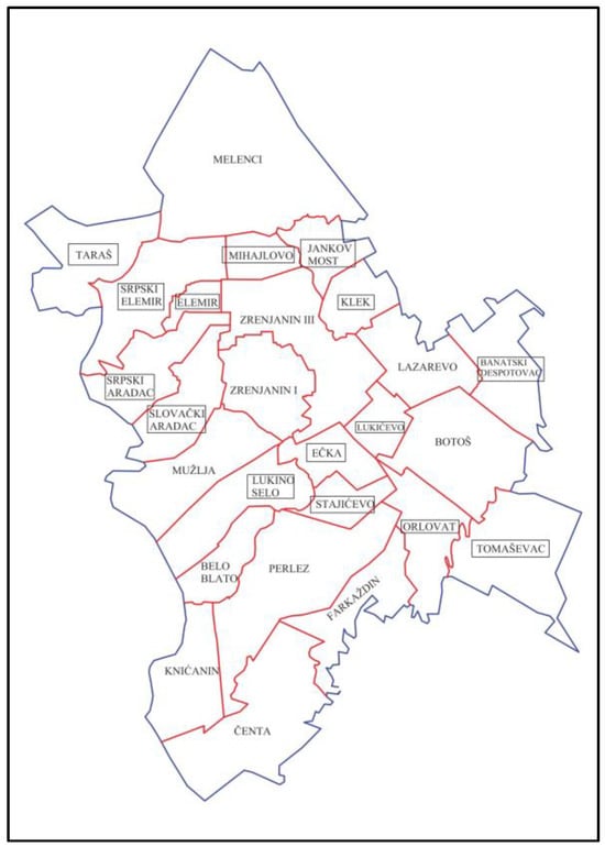 The materials comprised the official data of cadastral municipalities (belonging to the municipality of Zrenjanin, Vojvodina region, Serbia), taken from the geodetic authority and statistical office of the Republic of Serbia (RZS). The considered cadastral municipalities were located approximately at the following coordinates: latitude, 45°23′58.95″ N; longitude, 20°25′10.45″ E (source—Google Earth). The cadastral municipalities investigated in this research are shown in Figure 1.