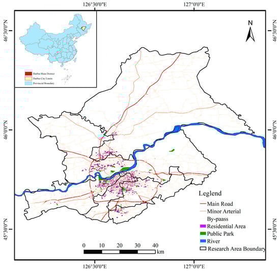Harbin is the capital of Heilongjiang Province and the center city of the northeastern part of China. It is an essential national manufacturing base, a famous historical and cultural city, and an international ice and snow cultural city. Because some urban areas in Harbin are not well developed and have a low population density, the main urban area, which is well constructed and has a concentrated population density, was selected as the survey region, which is more meaningful for this study. The main urban areas selected for this paper include the planned urban built-up areas of Daoli District, Daowai District, Nangang District, Xiangfang District, Pingfang District, Songbei District, and Hulan District, with a total land area of 4631.7 km2 (Figure 1). According to the master plan of Harbin City, by 2020, the greening rate of the main urban area was predicted to reach more than 38%, and 2598 m2 was predicted to increase based on the original public green space of 2094 m2. At present, the parkland in the main urban area is 3039 m2, accounting for 64.77% of the public green space in the main urban area.
