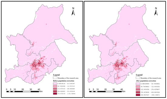 The primary data used in this study include (1) the administrative boundary data (district level) on the main urban area of Harbin City in 2021, which were derived from platforms such as Tianmap and DataV.GeoAtlas, and were mainly used to determine the scope of this study and the study unit; (2) POI and AOI data on residential areas and parkland in the primary urban area of Harbin City, derived from Baidu Open Platform and Gaode Open Platform, which were mainly used to provide park green space supply; and (3) road data on Harbin’s main urban area, obtained through Open Street Map (OSM) and using the Open Platform of Gaode Map (AMAP Inside), which were used as verification. (4) The required data for calculating the demand for park green space includes two sources: the 2020 Worldpop 100 m Population Grid (available at https://www.worldpop.org, accessed on 11 November 2023), which provided information about population distribution, and the 7th Population Census data (district level) available on the Harbin Municipal People’s Government website, which were used to adjust the population grid (Figure 2).