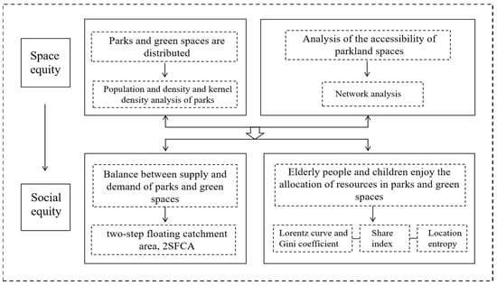 As a public good, urban green space has essential economic and ecological benefits in urban planning. However, there are inequities in the allocation process of urban parkland, and disadvantaged groups’ voices need more consideration [,]. Therefore, the study of spatial justice in urban parkland is of great importance to the research and practice of public policy on urban green space construction. This paper constructs a parkland layout equity research framework for empirical case analysis of parkland in the primary city of Harbin (Figure 3), divided into the two levels of spatial equity and social equity.